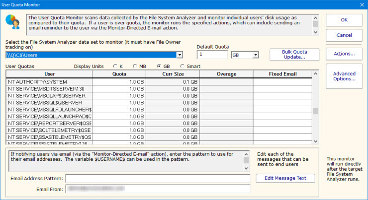 Configuration of this monitor works best by letting the File System Analyzer complete one scan first. That way the User and Curr Size columns will be filled in automatically.